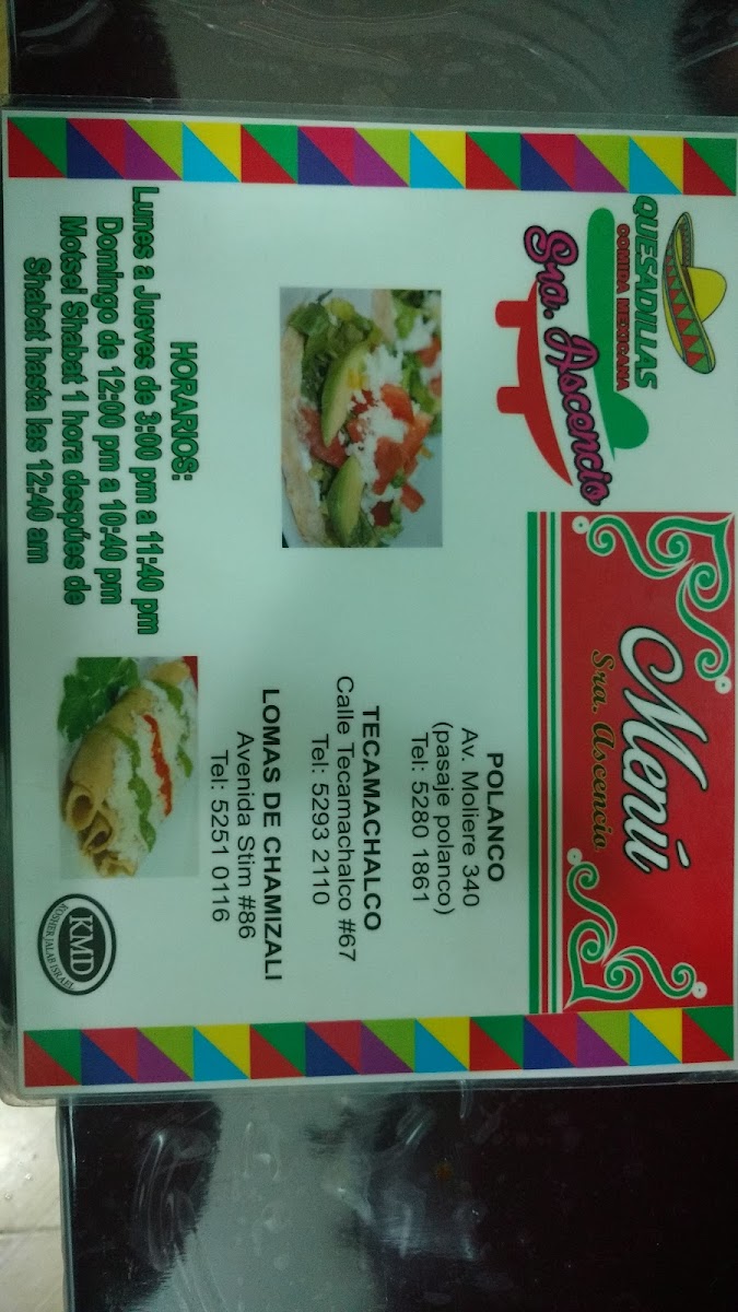 Welcome to Senora Ascencio, a culinary gem nestled in Naucalpan de Juarez, where authentic Kosher Mexican cuisine takes center stage. Located at Tecamachalco 67, this charming spot offers a delectable menu filled with vibrant flavors and traditional recipes. Guests rave about the incredible quesadillas, crafted with perfectly made tortillas and generous, high-quality fillings, all served in a cozy atmosphere that invites you to linger.